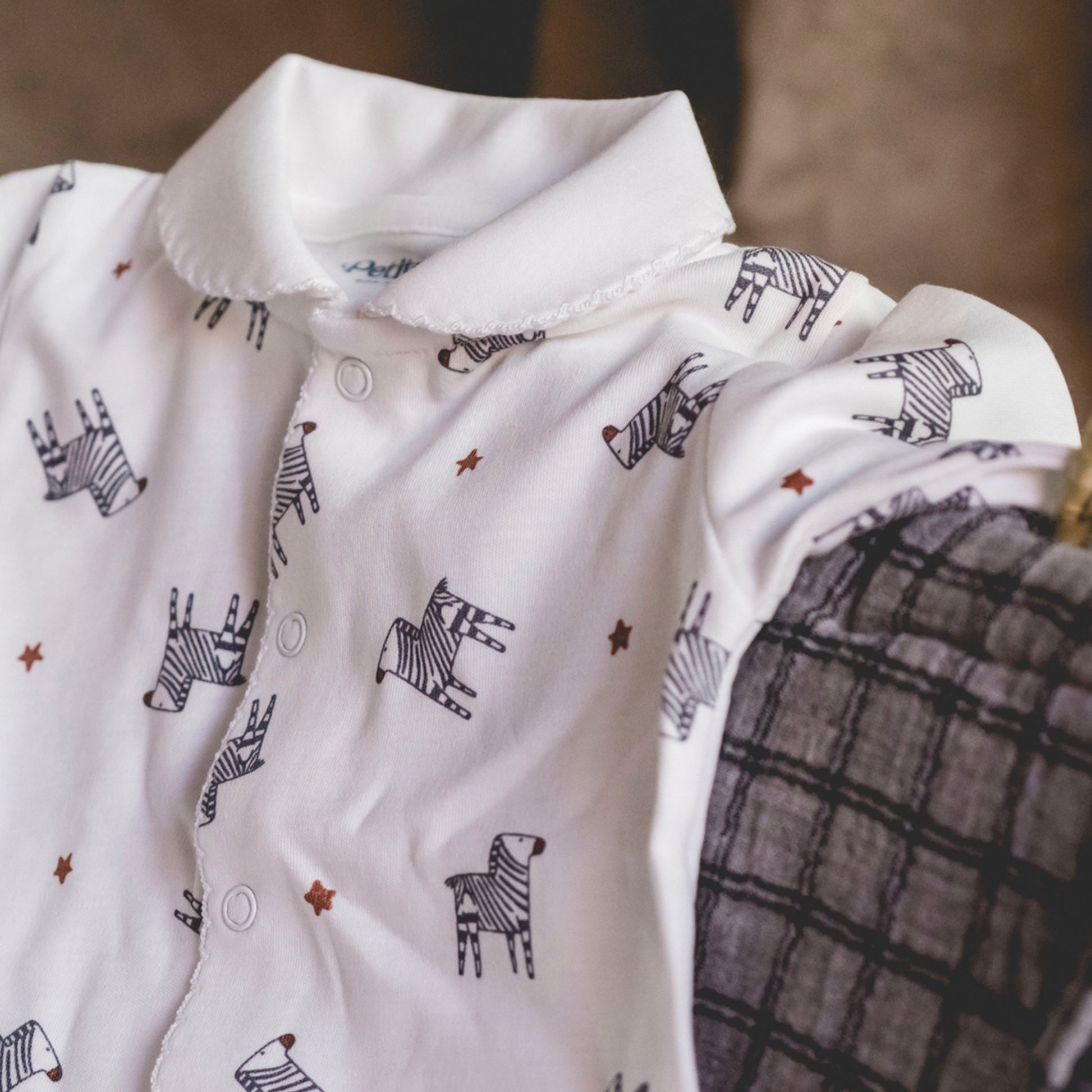 Pijama tipo camisero blanco con estampado original de cebras de "Algo de Jaime" adaptado por Petite Siesta, vivo marrón y bolsillo en la parte superior izquierda de la camisa; pantalón con cintura elástica.